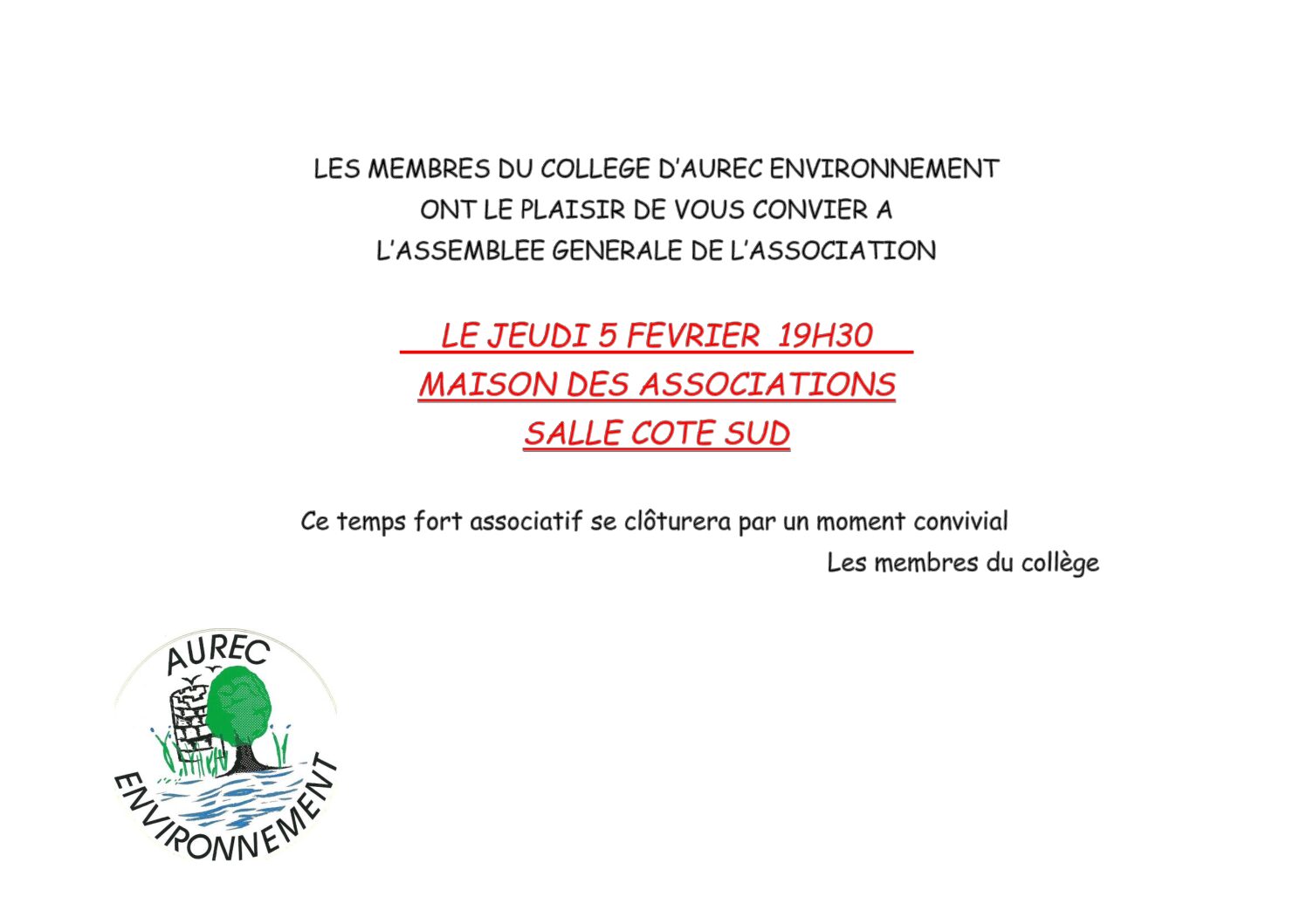 Les membres du collège d’AUREC ENVIRONNEMENT ont le plaisir de vous convier à l’assemblée générale de l’association le jeudi 5 février à 19h30.