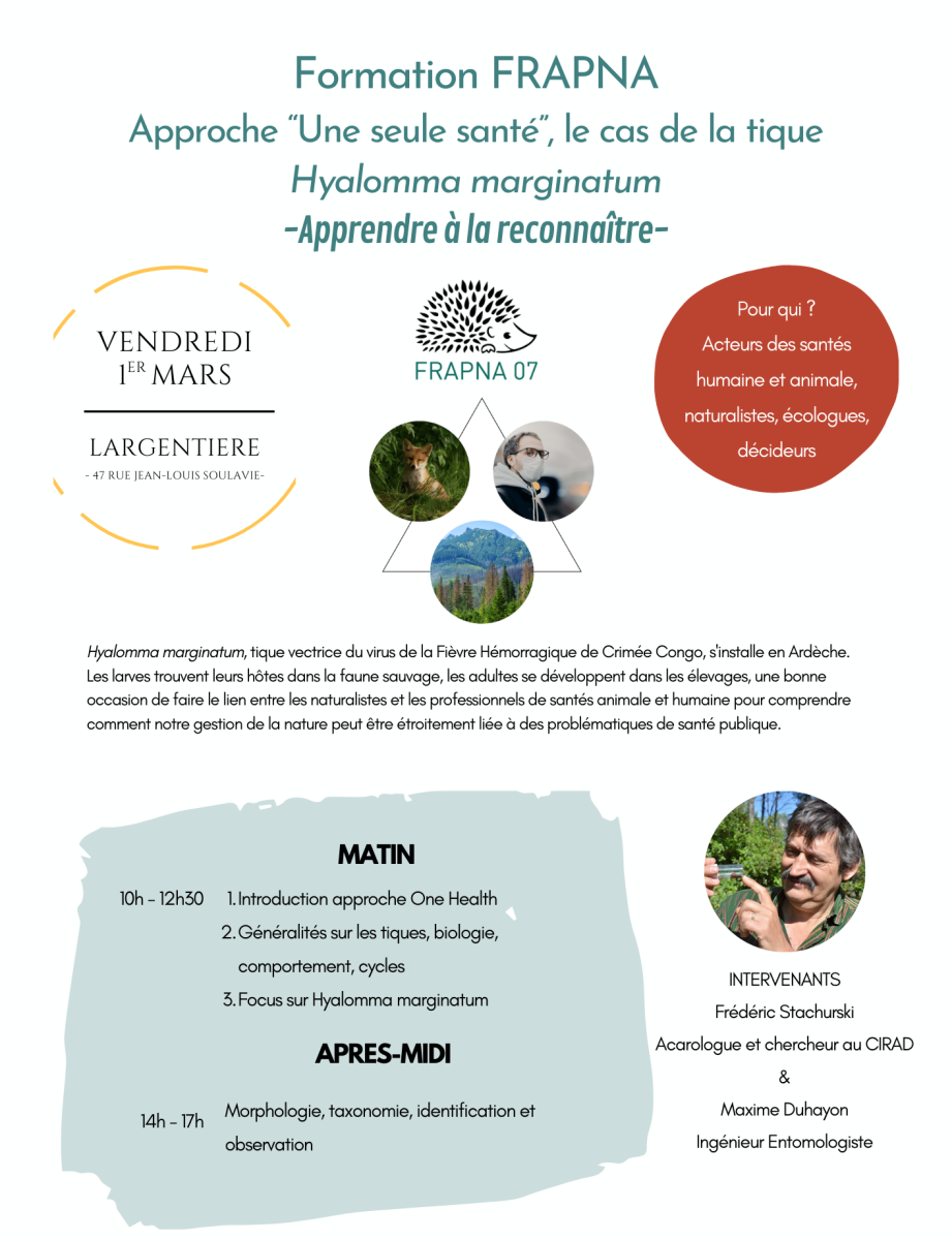 Hyalomma marginatum, une tique potentiellement vectrice de la fièvre hémorragique de Crimée Congo, s'installe en Ardèche. Une occasion de faire le lien entre les naturalistes et les professionnels de santé pour comprendre comment notre gestion de la nature peut être étroitement liée à des problématiques de santé humaine.