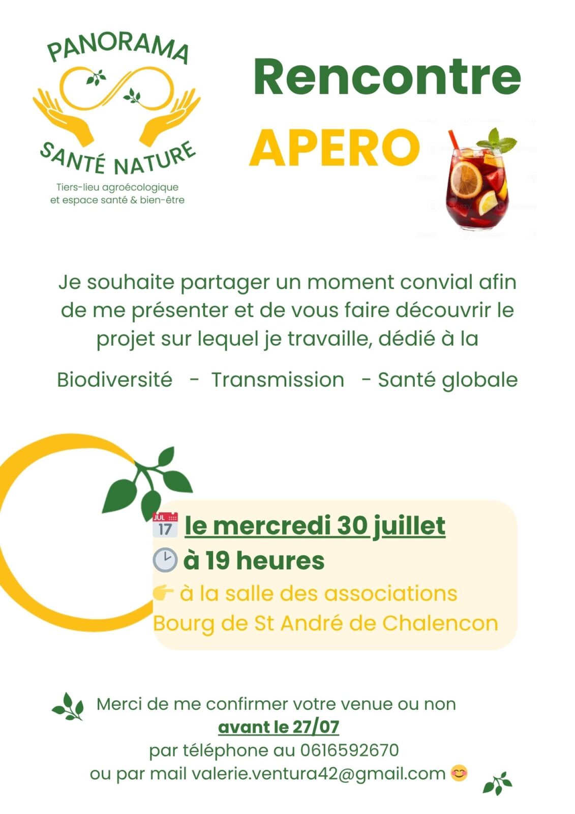 J’ai le plaisir d’inviter les riverains de Saint-André-de-Chalencon à une rencontre conviviale, le mercredi 30 juillet à 19h, pour me présenter ainsi que le projet Panorama Santé Nature.