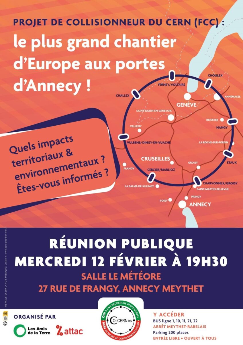 Les Amis de la Terre 74 et ATTAC 74 Annecy organisent, le mercredi 12 février à 19h30 à Meythet (Annecy) à la salle du Météore, une réunion publique d’information sur le projet du CERN de « Futur Collisionneur Circulaire ». L’association Co-Cernés viendra nous éclairer notamment sur les impacts territoriaux et environnementaux de ce projet.