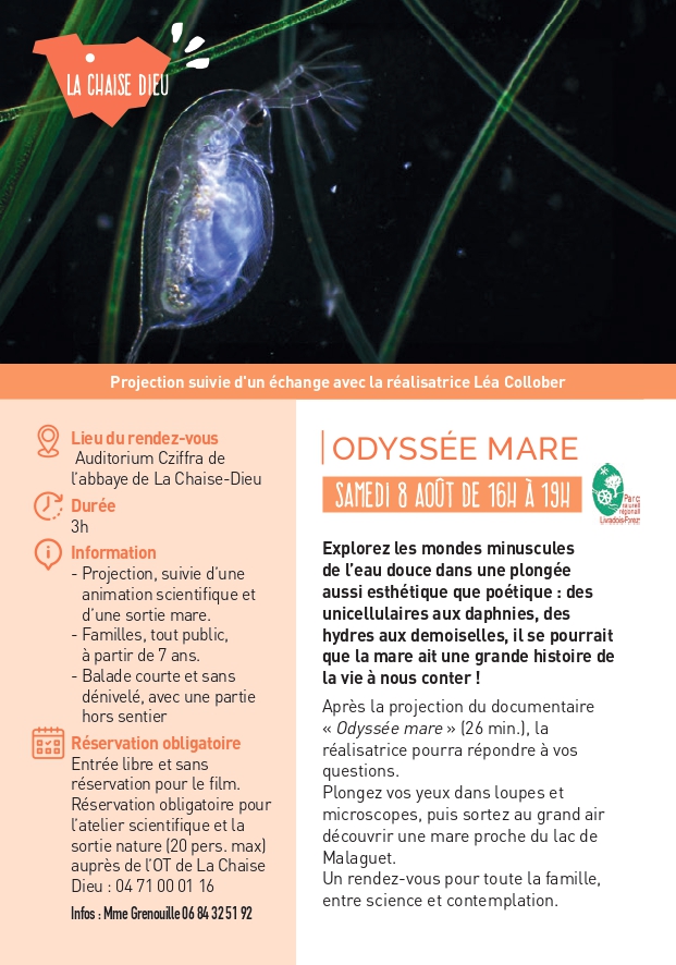 Après la projection du documentaire « Odyssée mare » (26 min.), la réalisatrice pourra répondre à vos questions. Plongez vos yeux dans loupes et microscopes, puis sortez au grand air découvrir une mare proche du lac de Malaguet. Un rendez-vous pour toute la famille, entre science et contemplation.