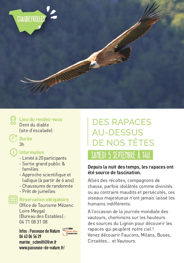 Depuis la nuit des temps, les rapaces ont été source de fascination. Alliés des récoltes, compagnons de chasse, parfois idolâtrés comme divinités ou au contraire maudits et persécutés, ces oiseaux majestueux n’ont jamais laissé les humains indifférents. A l’occasion de la journée mondiale des vautours, cheminons sur les hauteurs des sources du Lignon pour découvrir les rapaces qui peuplent notre ciel ! Venez découvrir Faucons, Milans, Buses, Circaètes… et Vautours.